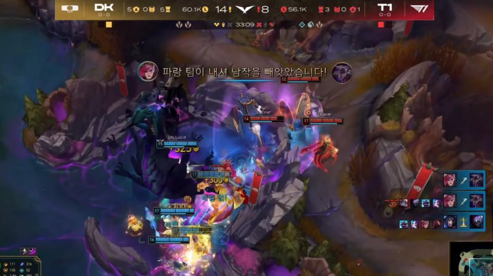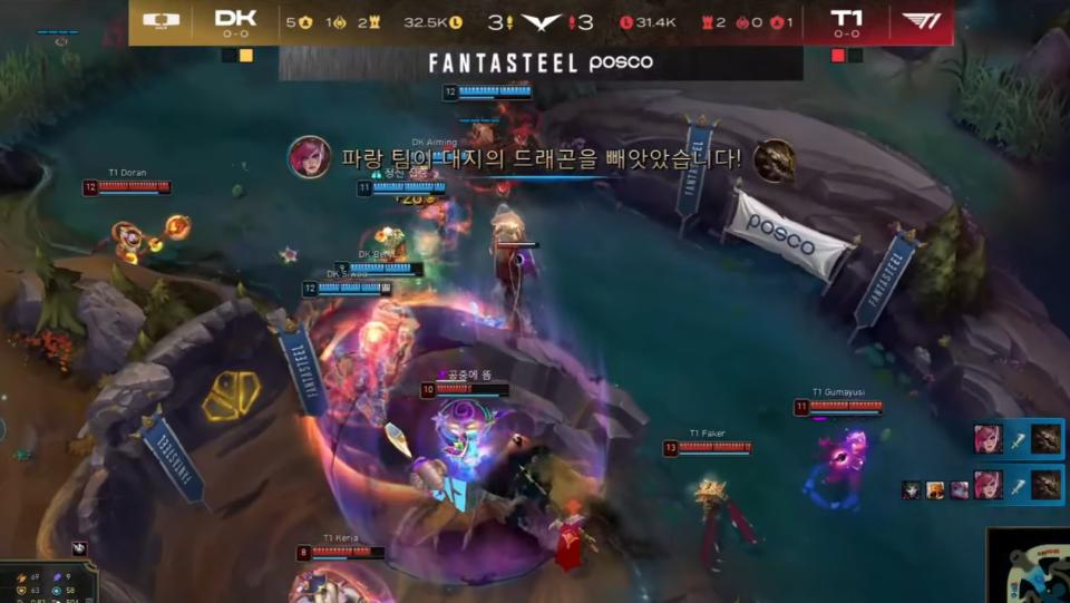 之后双方就是围绕小龙和大龙 拉扯,只可惜T1在小龙以及后续大龙的拼惩戒环节再一次完全失败,不仅龙魂被断,抖机灵的一波偷大龙也被lucia抢断,最终DK携带大龙buff,成功拿下了比赛。