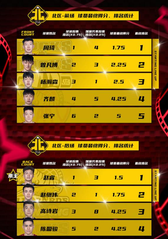 北区前场排名:周琦、曾凡博、杨瀚森、齐麟、张宁;北区后场排名:赵睿、赵继伟、高诗岩、陈盈骏。