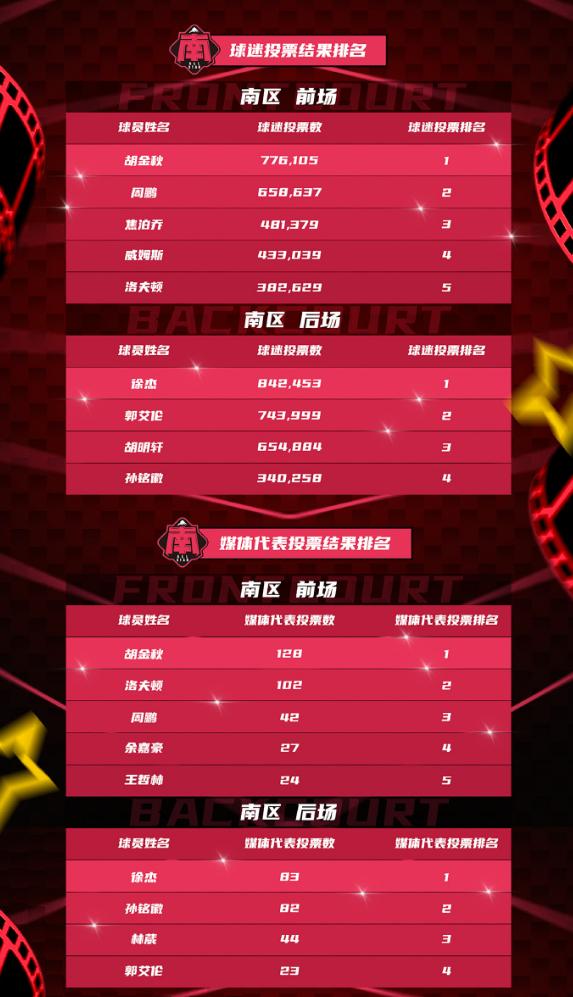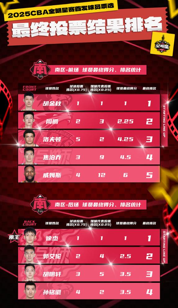 南区前场的投票排名:胡金秋、周鹏、洛夫顿、焦泊乔、威姆斯;南区后场投票排名:徐杰、郭艾伦、胡明轩、孙铭徽。