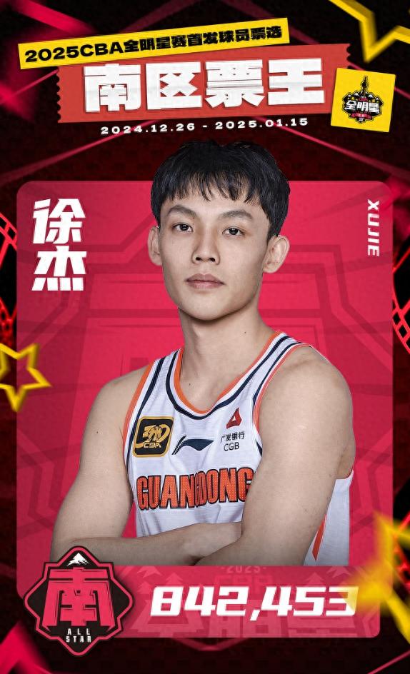 北京时间1月17日,CBA官方公布,2025年全明星首发球员投票结果,这次投票截止于2025年1月15日,历经球迷们21天的投票、综合媒体代表的投票结果, 徐杰(广东男篮)以842453票当选南区票王及总票王。