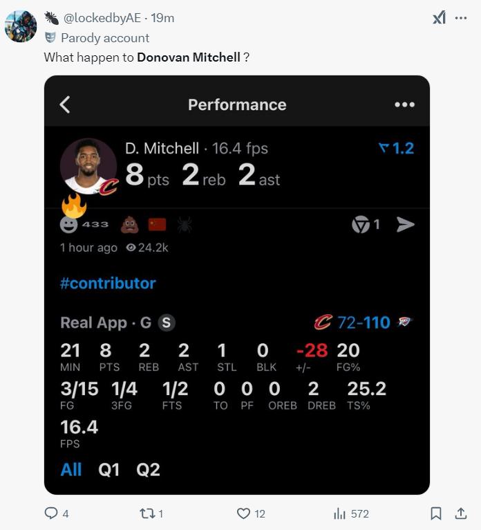 骑士球迷晒出米切尔15中3拿到8分2篮板2助攻1抢断,命中率20%,真实命中率25.2%,正负值-28的数据写道:米切尔怎么了?