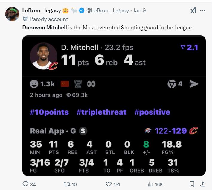 美球迷:米切尔是NBA最平庸的球员,他一直被高估,随便你们怎么说,他可以面对一支弱旅丢40分,也可以面对强队拿14-18分,他的表现太荒谬了。