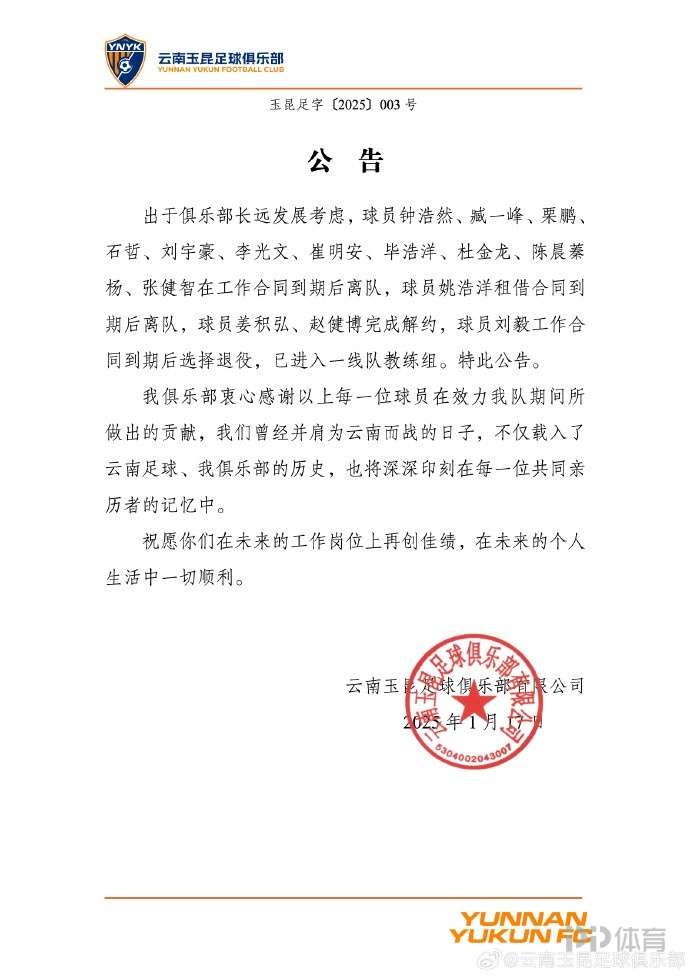 玉昆官方同时感谢了每一位球员在效力球队期间做出的贡献,并祝愿各位球员在未来的工作和生活中一切顺利。