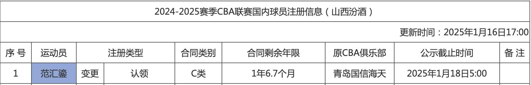 北京时间1月16日,据CBA官方网站显示,山西汾酒职业篮球俱乐部正式签下范汇鎏,合同类型为C类,剩余期限1年6.7个月。