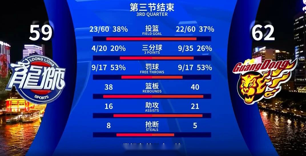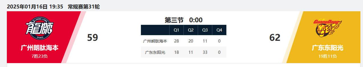 北京时间1月16日,CBA常规赛广东客场对阵广州。第三节结束,广东62-59反超广州。