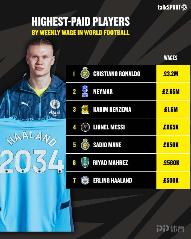 哈兰德与曼城签下长达10年的新合约,基础周薪也涨到50万镑,英媒talkSPORT盘点了目前足坛6名仅有的周薪高于哈兰德的球员,他们几乎都效力于沙特联赛。