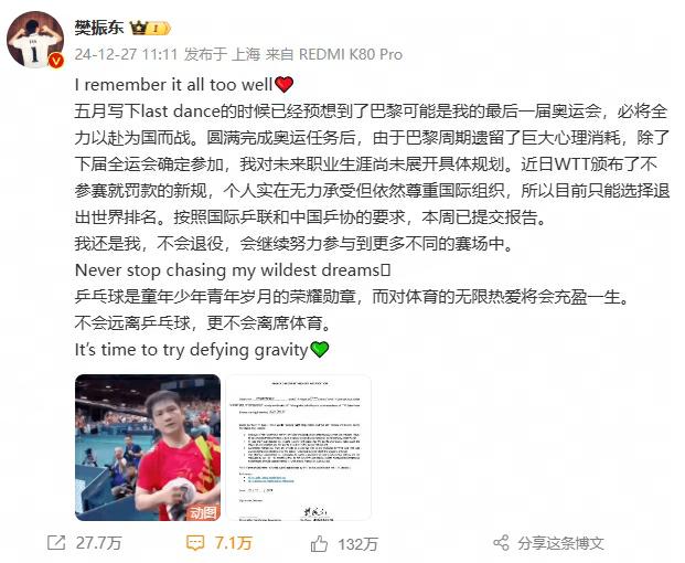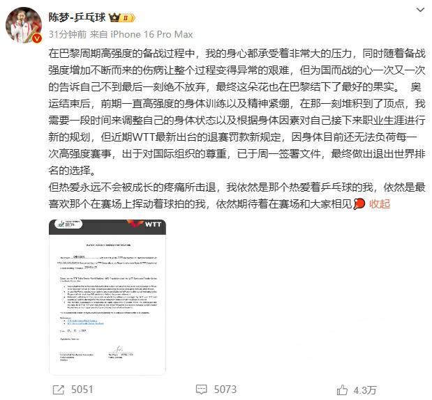 两人的文字里都提到了WTT出台的退赛罚款规定,提到了巴黎周期的消耗以及未来生涯的规划,我们基于他们的表述和相关规则,尝试着简单梳理一下具体情况: