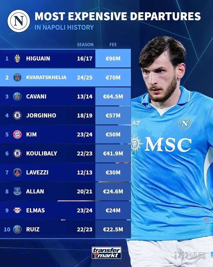德国转会市场列出了那不勒斯出售球员价格排名,伊瓜因9000万欧居首,克瓦拉茨赫利亚7000万欧次席。
