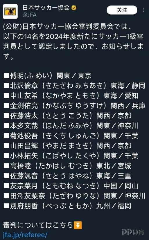日本足协今日公布新一期日本足协一级裁判资格名单,中国裁判傅明在列。