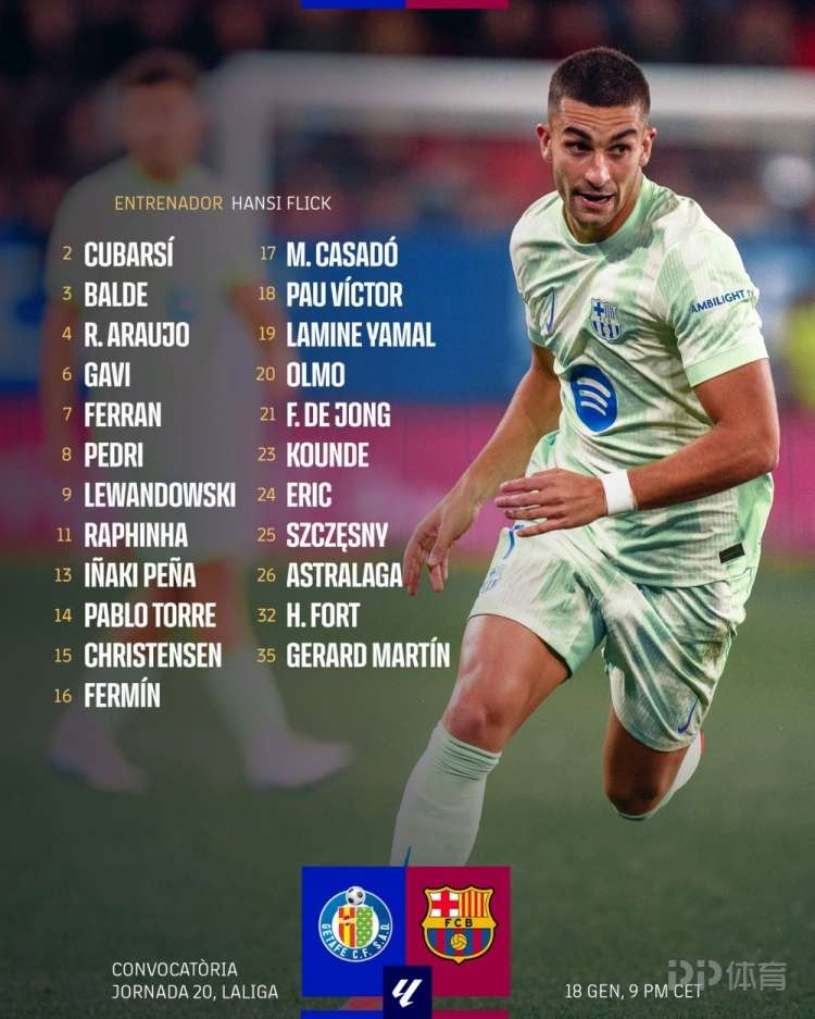 北京时间明天凌晨,巴萨将在西甲第20轮比赛中客场对阵赫塔费。巴萨公布了此役的球员名单,莱万、亚马尔、奥尔莫在列,克里斯滕森回归,法蒂缺席。