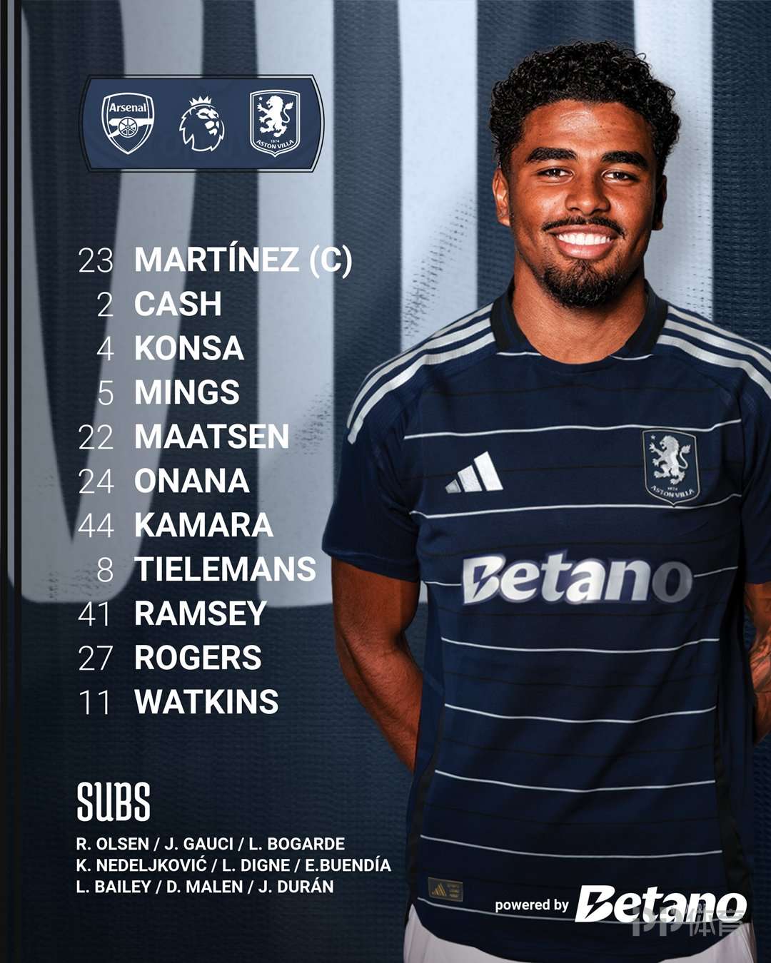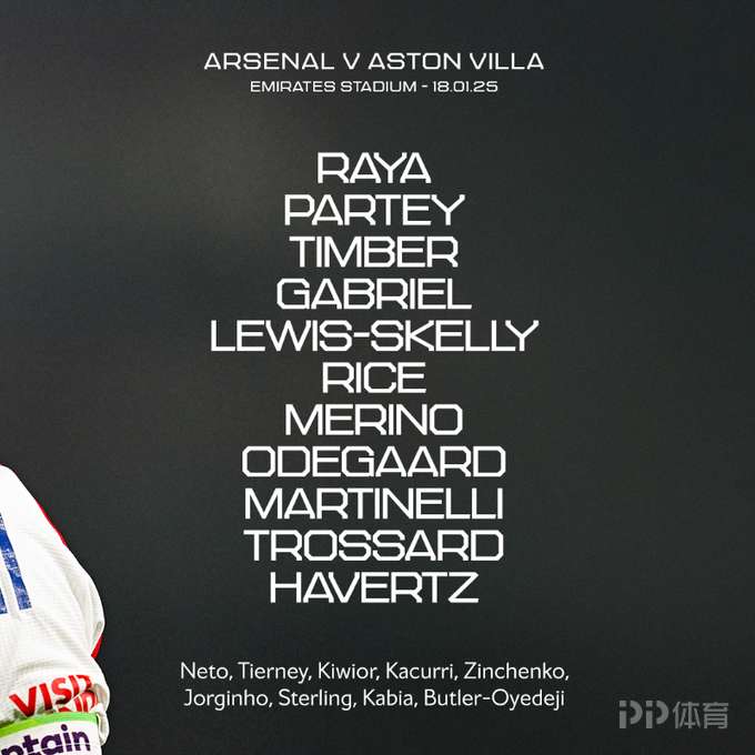 阿森纳vs维拉:萨利巴缺阵,哈弗茨、梅里诺首发,马伦替补