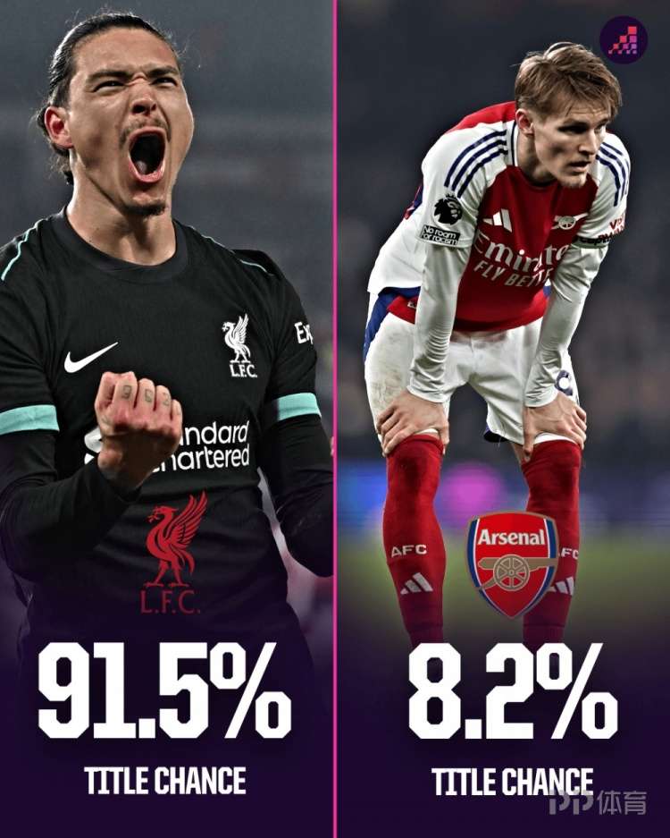 目前Opta更新了英超本赛季夺冠,利物浦升至了91.5%,阿森纳下降至8.2%。