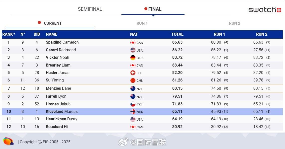 上届铜牌得主、本赛季首站卡德罗纳站冠军卡梅伦-斯波尔丁第二轮滑行得到86.63分,超过第一轮得到86.22分的美国选手雷蒙德-杰拉德0.41分获得冠军,收获第二个世界杯冠军。