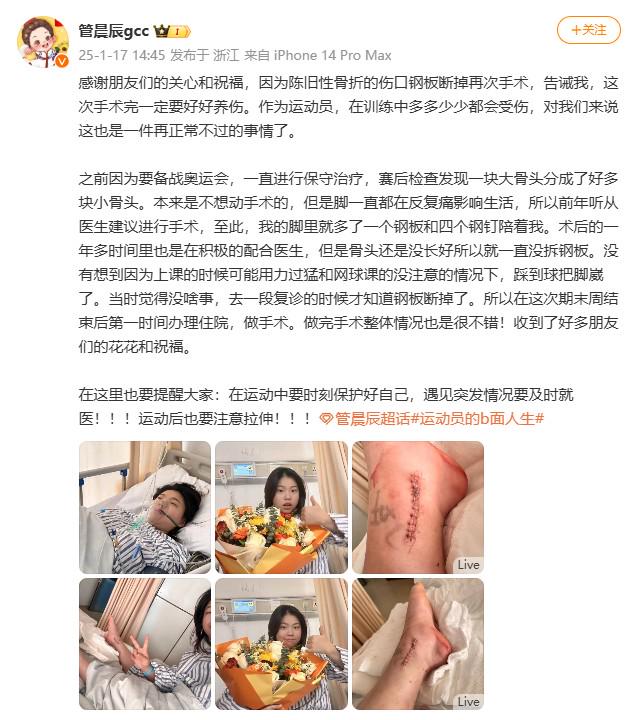 管晨辰写道:“感谢朋友们的关心和祝福,因为陈旧性骨折的伤口钢板断掉再次手术,告诫我,这次手术完一定要好好养伤。作为运动员,在训练中多多少少都会受伤,对我们来说这也是一件再正常不过的事情了。 ”
