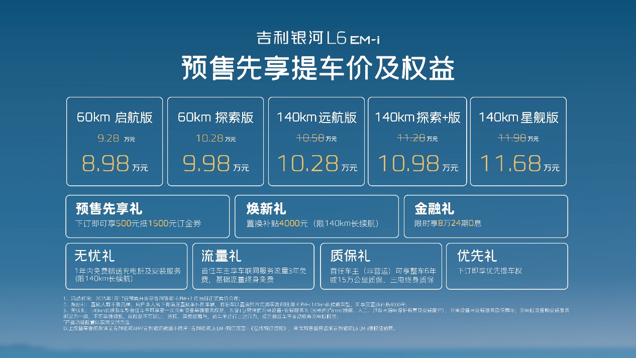在新能源汽车行业蓬勃发展的当下,市场对于多元化、高性能、低能耗车型的需求与日俱增。吉利银河在 2025 年 1 月 17 日正式开启 2025 款吉利银河 L6 EM-i 的预售,这款在原有主打性能的 3DHT 版型基础上,全新推出主打节能的 EM-i 版型车型,一经亮相便备受瞩目,有望在 A 级电混家轿市场掀起新的波澜。