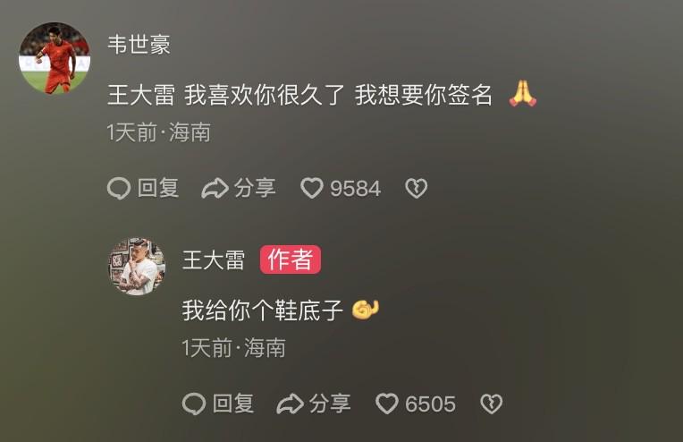 韦世豪在评论区写道:“王大雷,我喜欢你很久了,我想要你签名。”