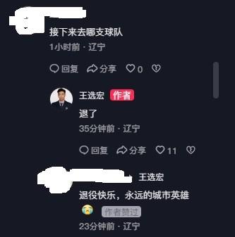 评论区内,网友留言询问王选宏“接下来去哪支球队?”对此,王选宏回复:“退了。”