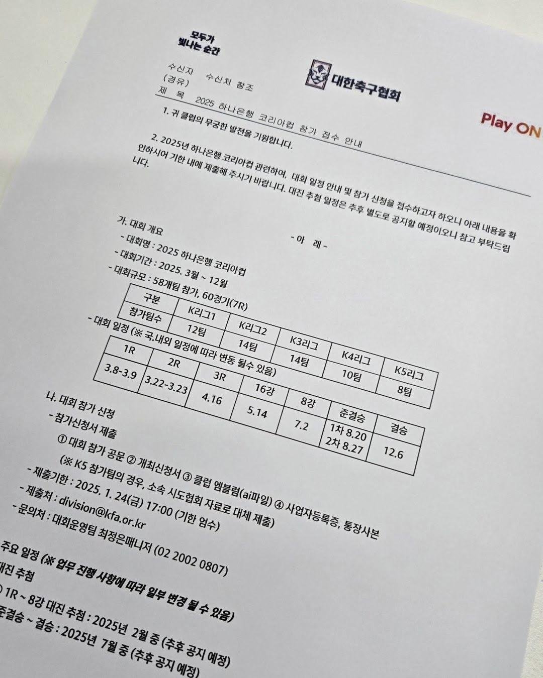 根据这份网上披露的文件显示。2025赛季韩国杯计划在3月8日正式拉开帷幕,最终的决赛将在12月6日进行。比起2024赛季的韩国杯计划,新赛季的韩国杯比上一年“晚开一周”,也“晚结束一周”。根据新赛季的计划,韩国杯将有58支球队参赛,其中K1联赛12支,K2联赛14支,K3联赛14支,K5联赛8支。由于韩国足协第55任会长有最终比赛时间决定权,因此郑梦奎在还未选出新会长的情况下,果断作出了决策,并提出在1月24日,K5球队想要参加,必须提交声明给韩国足协交由审核,最终获得唯一的八个席位。不过由于韩国足协第54任会长任期将在明天结束,这意味着,韩国足协在那个时候,从管理层角度已经是“临时代理协会”,没有决策权。而原定在2月初的1~8强抽签仪式,也因为会长未定将在2月中旬计划进行。而这个计划,前提是会长必须在2月诞生。