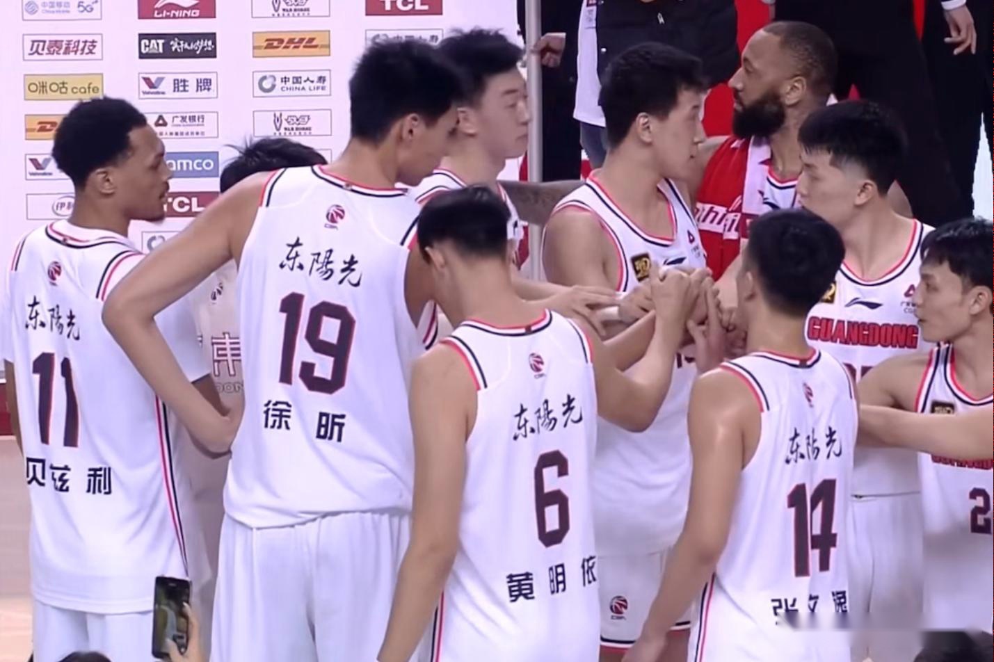 赛后广东加油鼓劲的时候,每个人都比较淡定。因为这场比赛没什么难度。而这场比赛结束之后,广东已经获得了九连胜,他们的状态在持续保持。