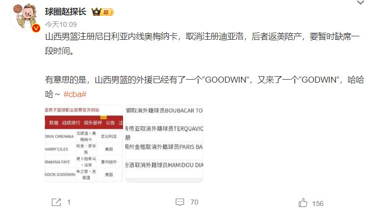山西男篮注册尼日利亚内线奥梅纳卡,取消注册迪亚洛,后者返美陪产,要暂时缺席一段时间。