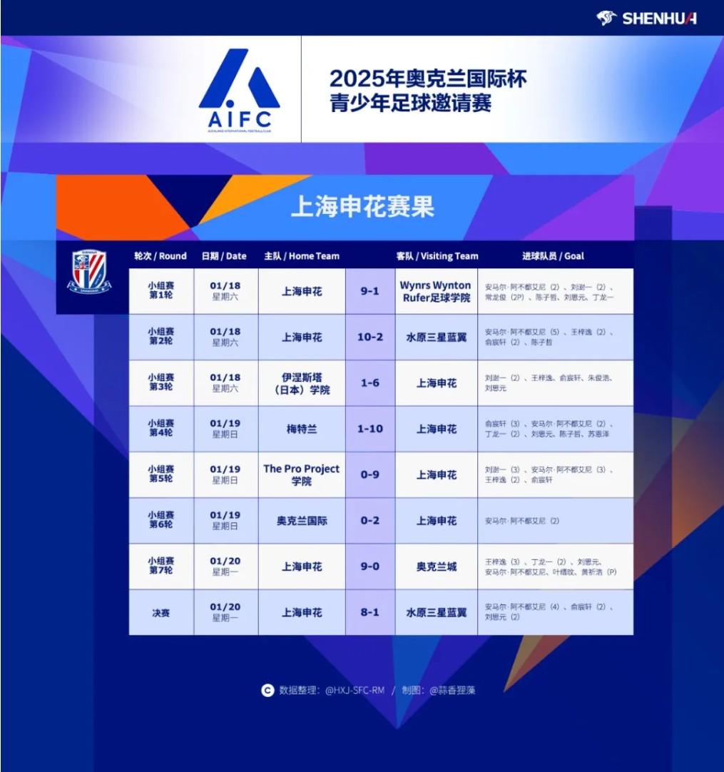 当地时间1月20日,2025年新西兰奥克兰国际杯青少年足球邀请赛结束了全部赛事,上海申花U12梯队在决赛中8-1击败韩国的水原三星蓝翼队,以8战全胜的战绩夺得该项赛事冠军。其中打进19球的安马尔-阿不都艾尼获得赛事最佳射手,刘澍一获得赛事最佳球员。