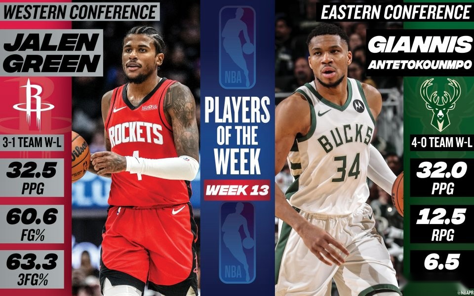 NBA官方宣布,火箭后卫格林和雄鹿前锋字母哥分别被评为第13周西部和东部的周最佳球员。