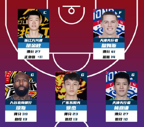 天津男篮外援詹姆斯以单场41分的数据领衔得分榜;