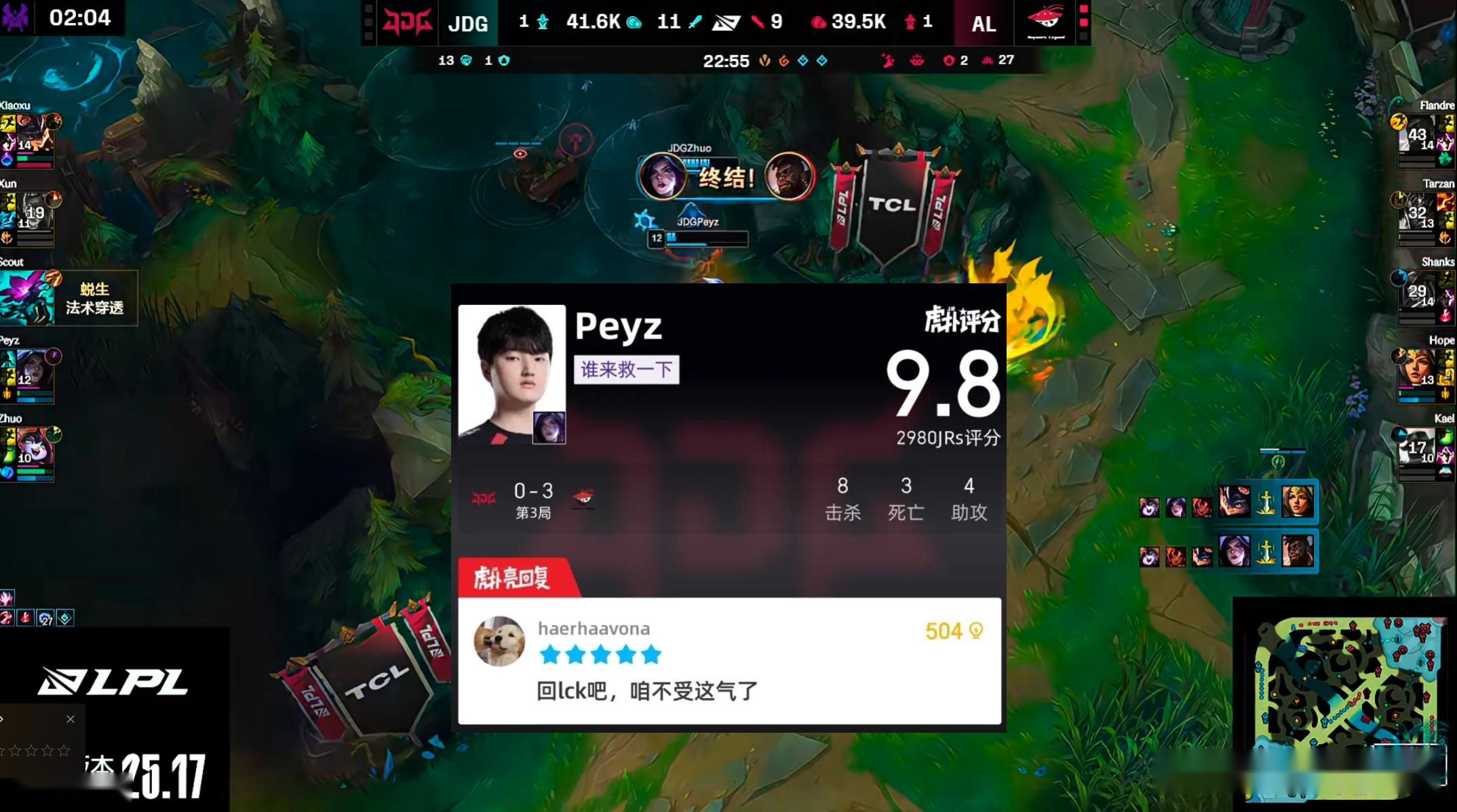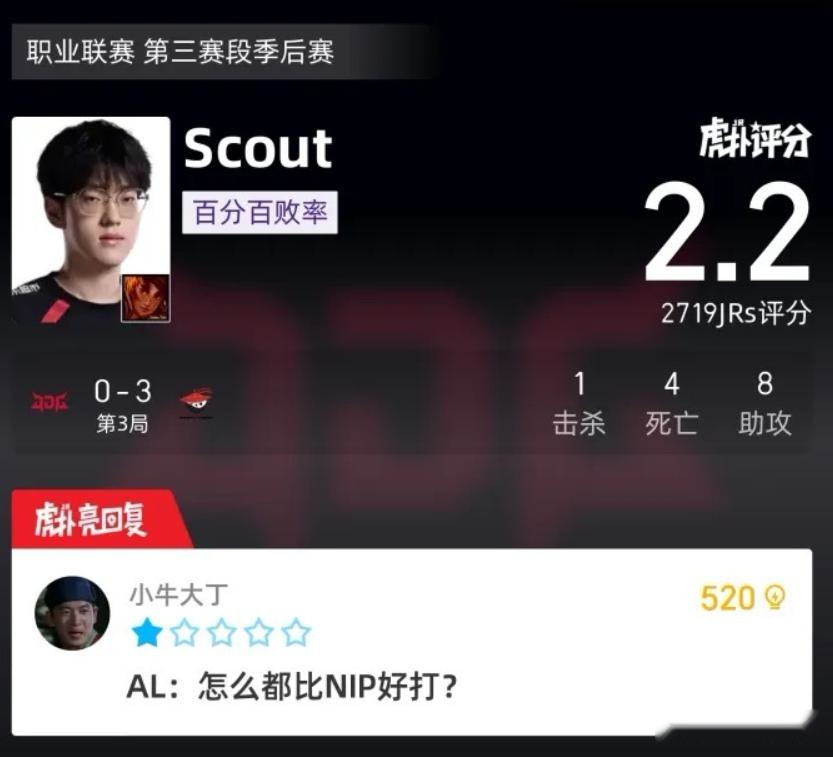 至于scout,已经很难用任何形容词来描述这位前冠军中单了,同样是韩援,看看peyz在干吗,你在干吗?又怂又送,最后关于辅助zhuo,真别对他抱有太高的期望了,他的实力在LPL整个辅助圈几乎排不上号的,如果不是有TES那几年的履历,估计现在就是在涅槃组待的一个选手。