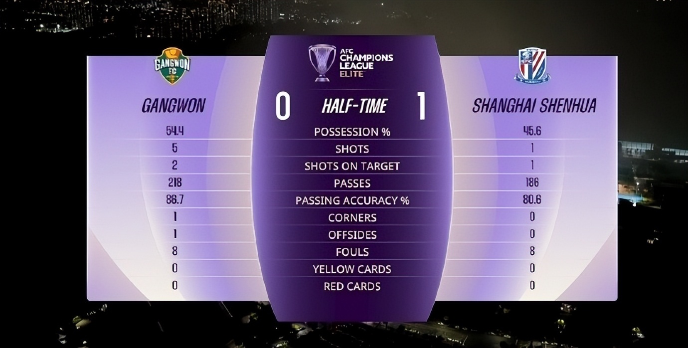 在上半场,申花控球率只有45.6%,主场作战的江原FC上半场有5次射门,但加布里埃尔错失破门良机。上半场补时第1分钟,特谢拉内切之后右脚劲射破门,申花此役第一次射门就破门。