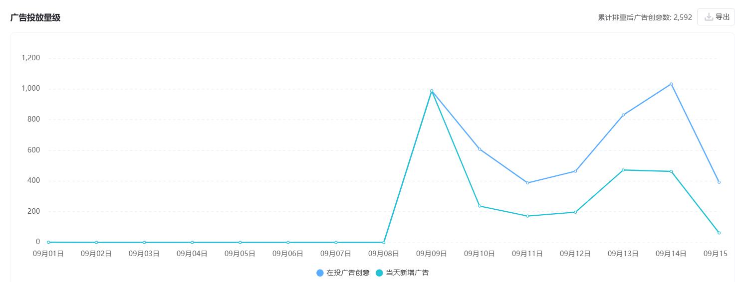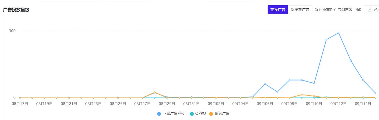 根据AppGrowing显示,截至9月15日《奔奔王国》小游戏端在投广告创意总数不过千,有规模的持续投放从9月6日开始,最高单日在投广告数不超过300。而在App端相对量级较大,9月8日开始投放,但最高单日在投广告数也在1000出头,在投广告总数不到2600条。