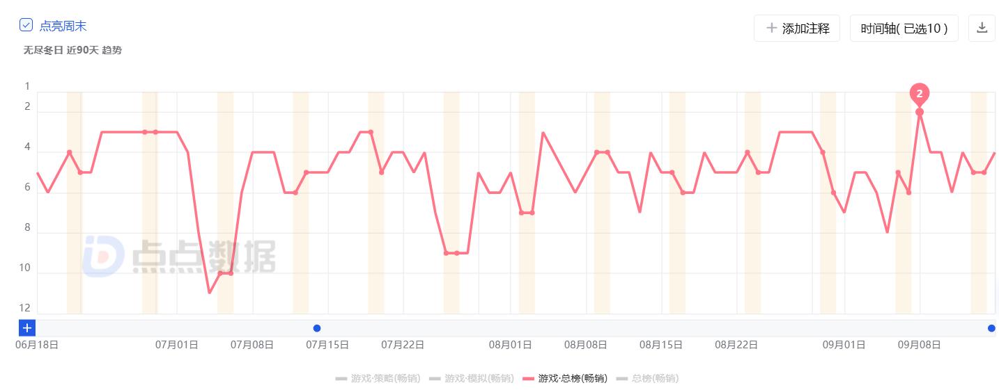 而如今,世纪华通新的增长点来到了《奔奔王国》。虽然《奔奔王国》玩法框架与《无尽冬日》高度相似,并且吸引了一批《无尽冬日》大R玩家,但我们从《无尽冬日》在微信小游戏和iOS畅销榜上排名变动可以看出其并受到影响,甚至在9月8日还追平了iOS畅销榜历史最高排名。