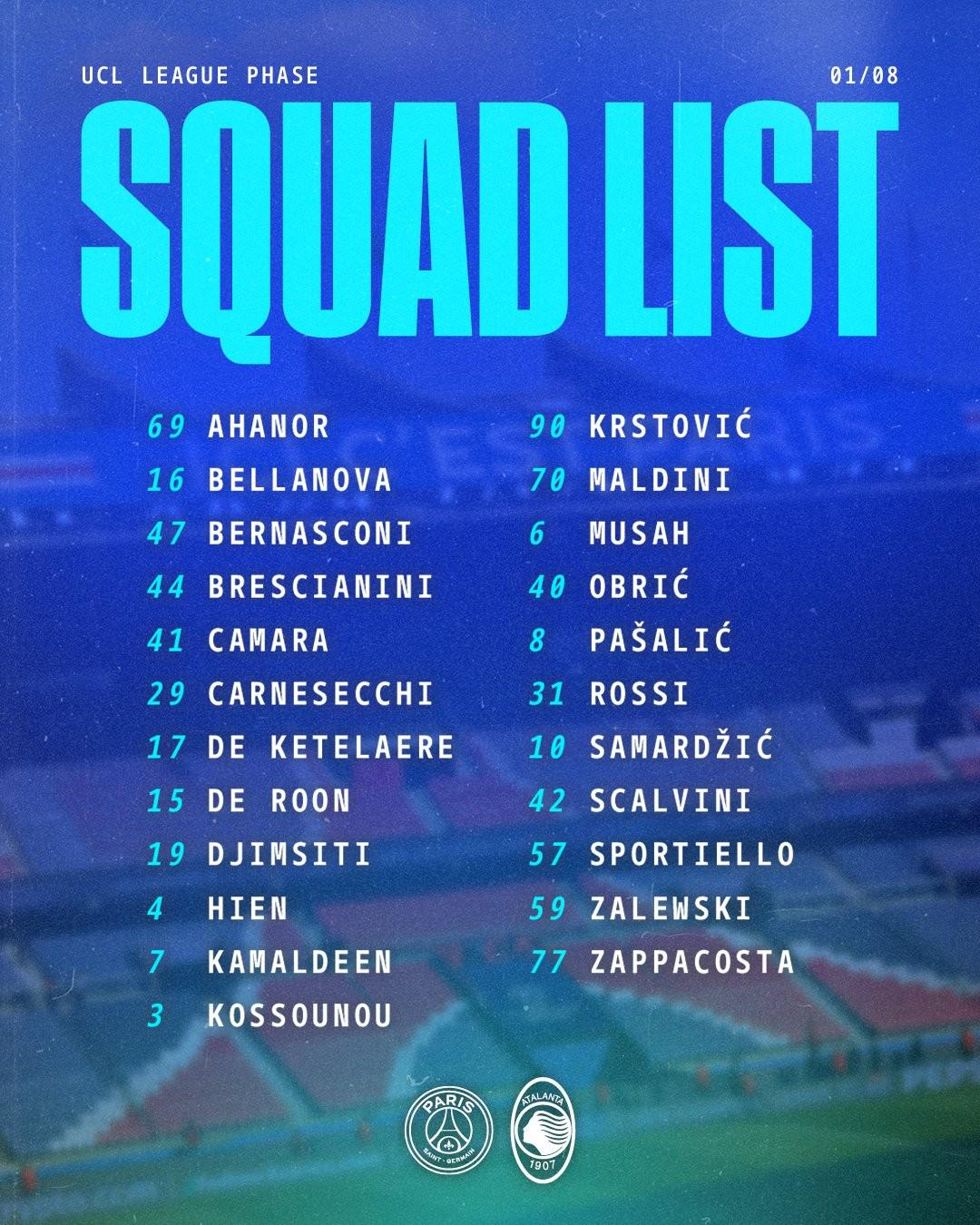6号-尤纳斯-穆萨、8号-帕萨利奇、10号-拉扎尔-萨马尔季奇、15号-德容恩、16号-贝拉诺瓦、17号-德凯特拉雷、44号-布雷夏尼尼、47号-贝尔纳斯科尼、59号-扎莱夫斯基、70号-丹尼尔-马尔蒂尼、77号-扎帕科斯塔