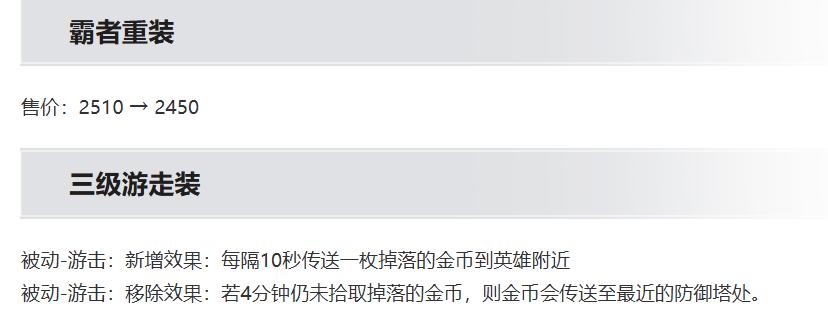 霸者重装加强: 价格降低60金币, 性价比变高。