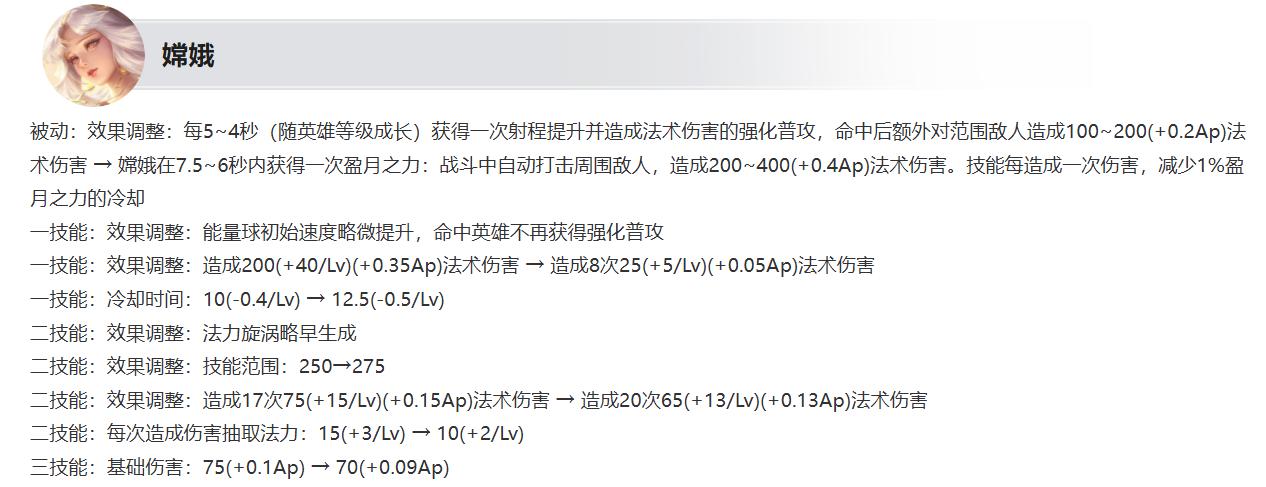 嫦娥小重做: 被动改为周期性自动攻击附近目标,每次技能伤害会减少被动CD,1技能改为造成8次伤害,2技能改为造成20次伤害,大招伤害降低。