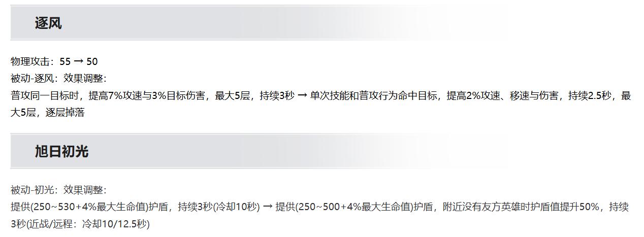 逐风大改: 被动改为技能和普攻命中就会提升攻速、移速和伤害,层数改为逐层掉落, 被动更容易触发。
