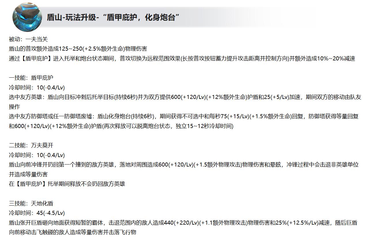 盾山重做: 1技能可以举起队友,切换为远程蓄力攻击,移动为队友控制。大招新增巨盾会向前移动,期间盾山可以自由移动。