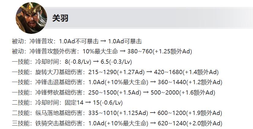 关羽小重做: 冲锋普攻改为可暴击,技能伤害全部改为额外Ad加成,1技能的后期CD增加1秒,2技能的后期CD减少2秒。