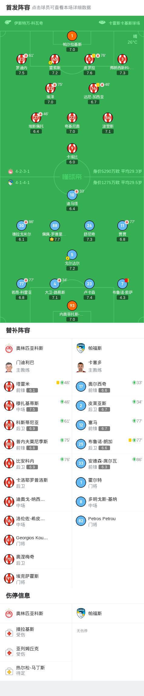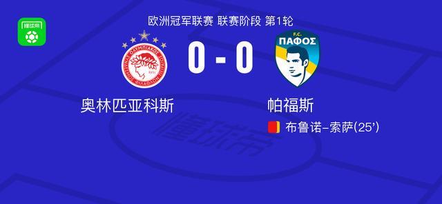 北京时间9月18日欧洲冠军联赛 联赛阶段 第1轮,奥林匹亚科斯对阵帕福斯。最终比分奥林匹亚科斯 0-0 帕福斯。