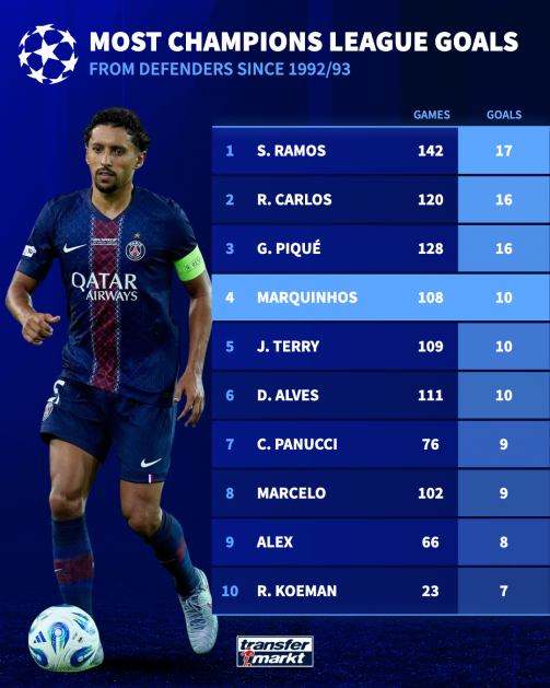 排名第二的是罗伯托-卡洛斯,这位巴西人120场比赛中攻入16球。前巴塞罗那后卫皮克以16个进球位居第三,他在128场欧冠比赛中达成了这一成就。马尔基尼奥斯凭借最近一粒进球升至第四位,在108场比赛中为巴黎贡献了10粒进球。
