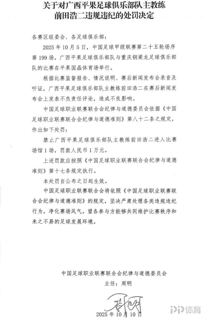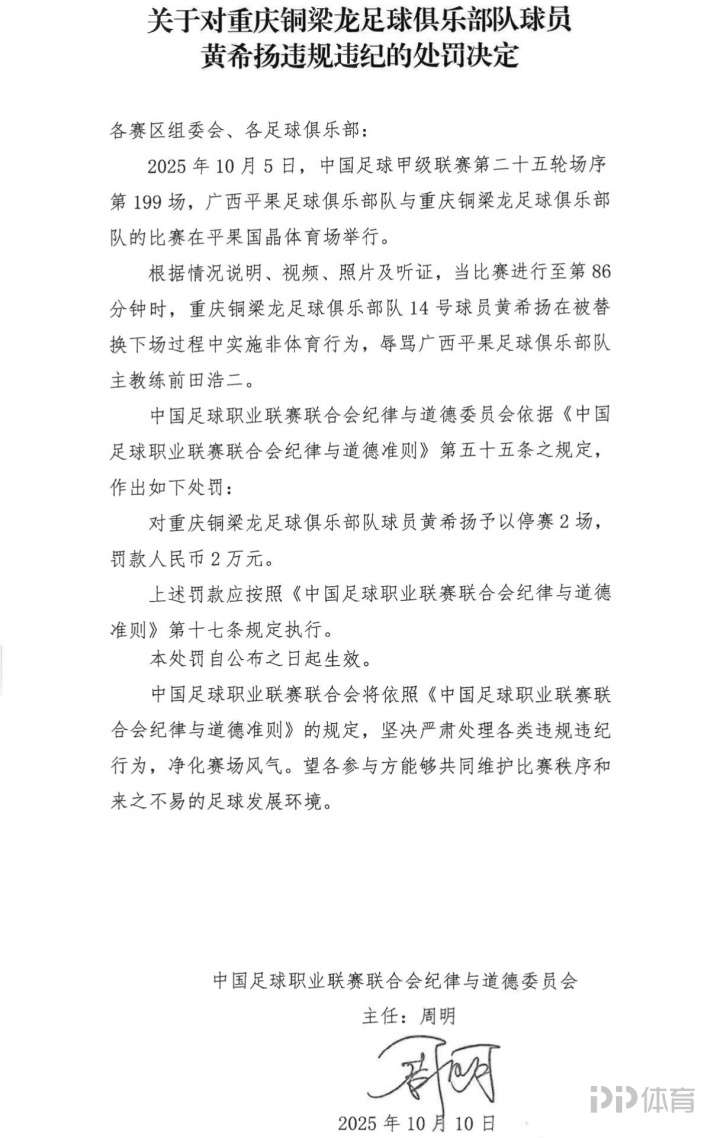 中足联官方发布处罚,铜梁龙球员黄希扬实施非体育行为,辱骂广西主帅前田浩二,停赛2场罚款2万。同时,广西主帅前田浩二因发表不负责任言论,禁赛1场罚款1万。