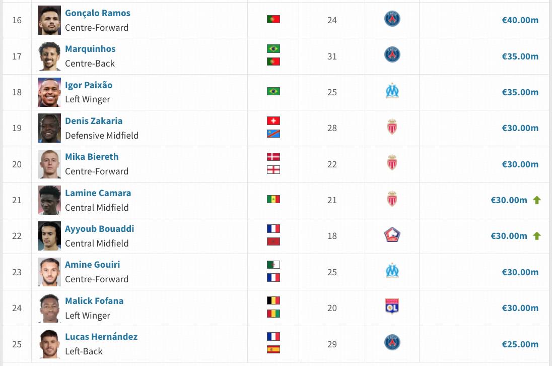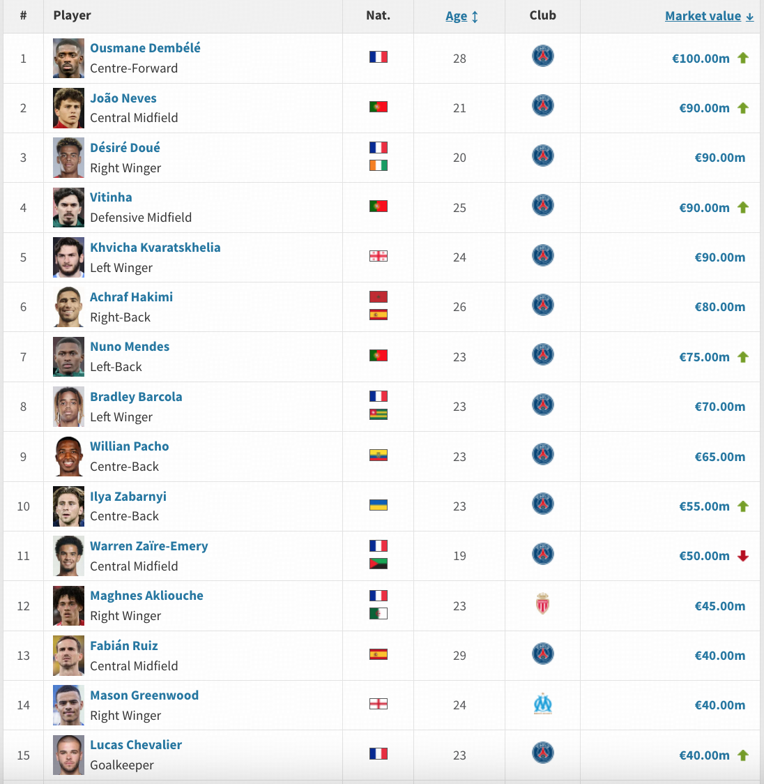 本期德转身价更新中,巴黎圣日耳曼队包办了前11名,身价最高的非大巴黎球员是摩纳哥队的阿克利乌什,身价4500万欧。