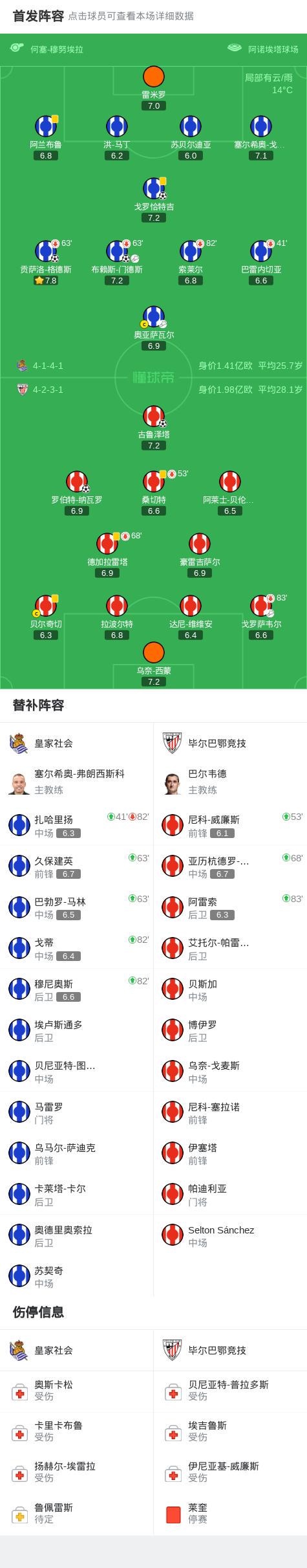 北京时间11月2日西班牙足球甲级联赛 联赛 第11轮,皇家社会主场对阵毕尔巴鄂竞技。皇家社会布赖斯-门德斯破门,贡萨洛-格德斯破门,戈罗恰特吉破门。毕尔巴鄂竞技古鲁泽塔破门,罗伯特-纳瓦罗破门。最终比分皇家社会 3 - 2 毕尔巴鄂竞技。