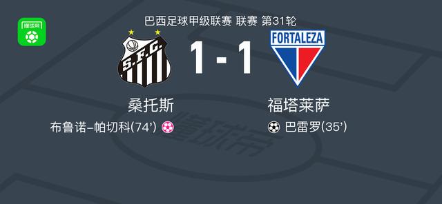 北京时间11月2日巴西足球甲级联赛 联赛 第31轮,桑托斯主场对阵福塔莱萨。福塔莱萨巴雷罗破门,布鲁诺-帕切科自摆乌龙。最终比分桑托斯 1 - 1 福塔莱萨。