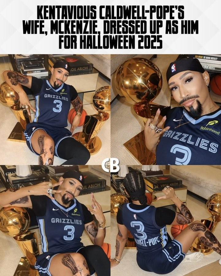 北京时间11月1日,灰熊队球员肯塔维奥斯-考德威尔-波普的妻子麦肯齐晒出了她的万圣节装扮,相比于主流的装扮,麦肯齐直接将装扮形象选择为波普本人。