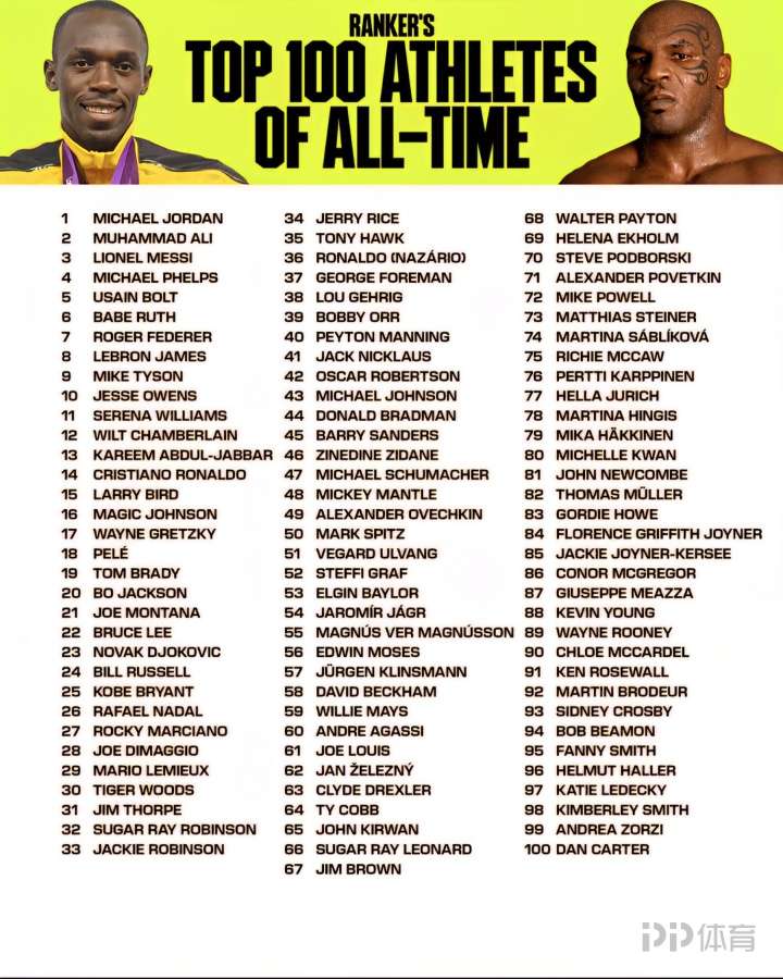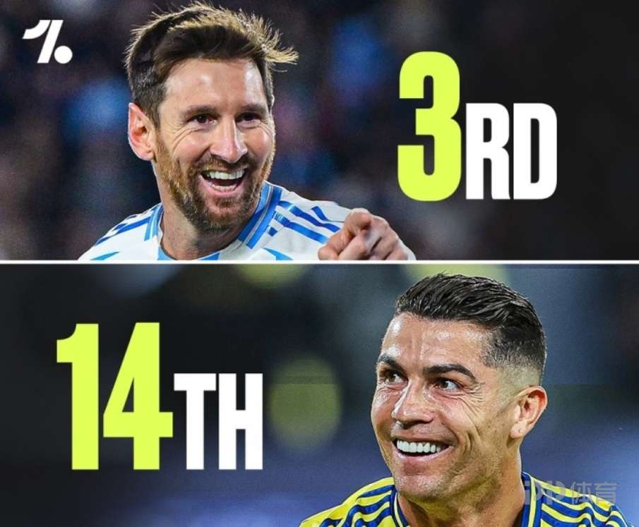 外媒Global Statistics排历史百大运动员,梅西第3,仅次于乔丹和拳王阿里。足坛9人上榜,仅梅西进入前10,C罗第14、贝利第18、大罗第36、齐达内第46。