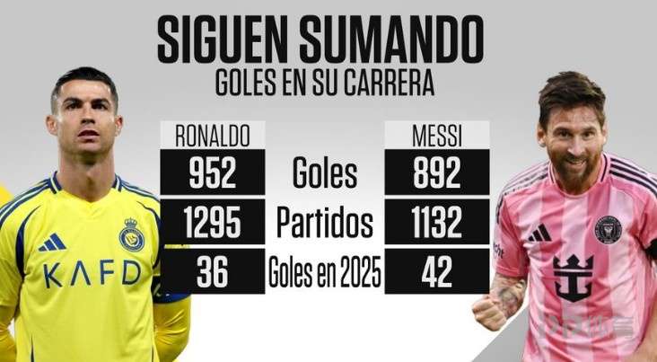 C罗生涯1295场比赛打进952球,其中2025年打进36球;梅西生涯1132场比赛打进892球,其中2025年打进42球。
