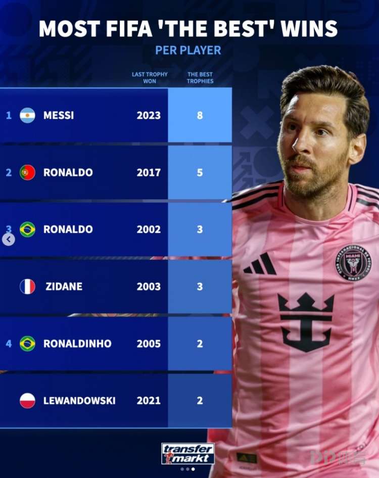 FIFA年度颁奖典礼结束,登贝莱获FIFA年度最佳球员。德转列FIFA年度最佳球员获奖次数,梅西8次最多,C罗第二,齐达内、罗纳尔多并列第三。