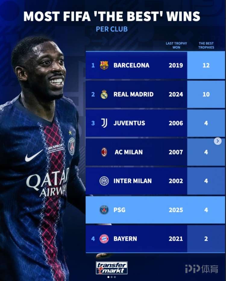 FIFA年度颁奖典礼结束,登贝莱获FIFA年度最佳球员,德转列各俱乐部球员获FIFA年度最佳球员次数,巴萨12次居首,皇马10次第二,尤文、米兰、国米、巴黎4次并列第三。