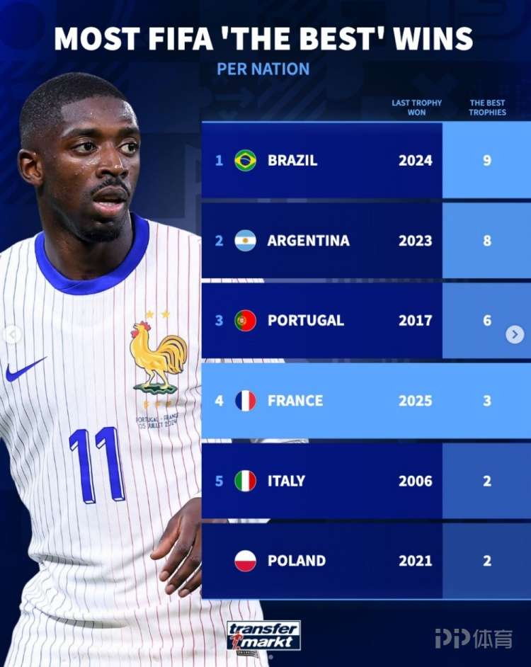 FIFA年度颁奖典礼结束,登贝莱获FIFA年度最佳球员,德转列各国球员获FIFA年度最佳球员次数,巴西9次最多,阿根廷8次第二,葡萄牙6次第三。