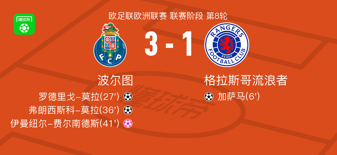 北京时间1月30日欧足联欧洲联赛 联赛阶段 第8轮,波尔图对阵格拉斯哥流浪者。波尔图罗德里戈-莫拉破门,弗朗西斯科-莫拉破门。格拉斯哥流浪者加萨马破门,伊曼纽尔-费尔南德斯自摆乌龙。最终比分波尔图 3-1 格拉斯哥流浪者。